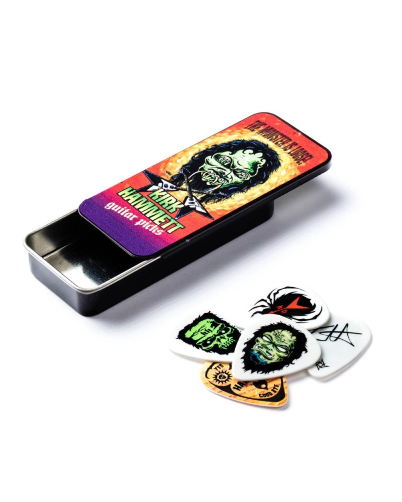 Estuche metálico con una selección de 6 púas para guitarra decoradas con diseños de Dunlop y guitarrista de metálica Kirk Hammet.