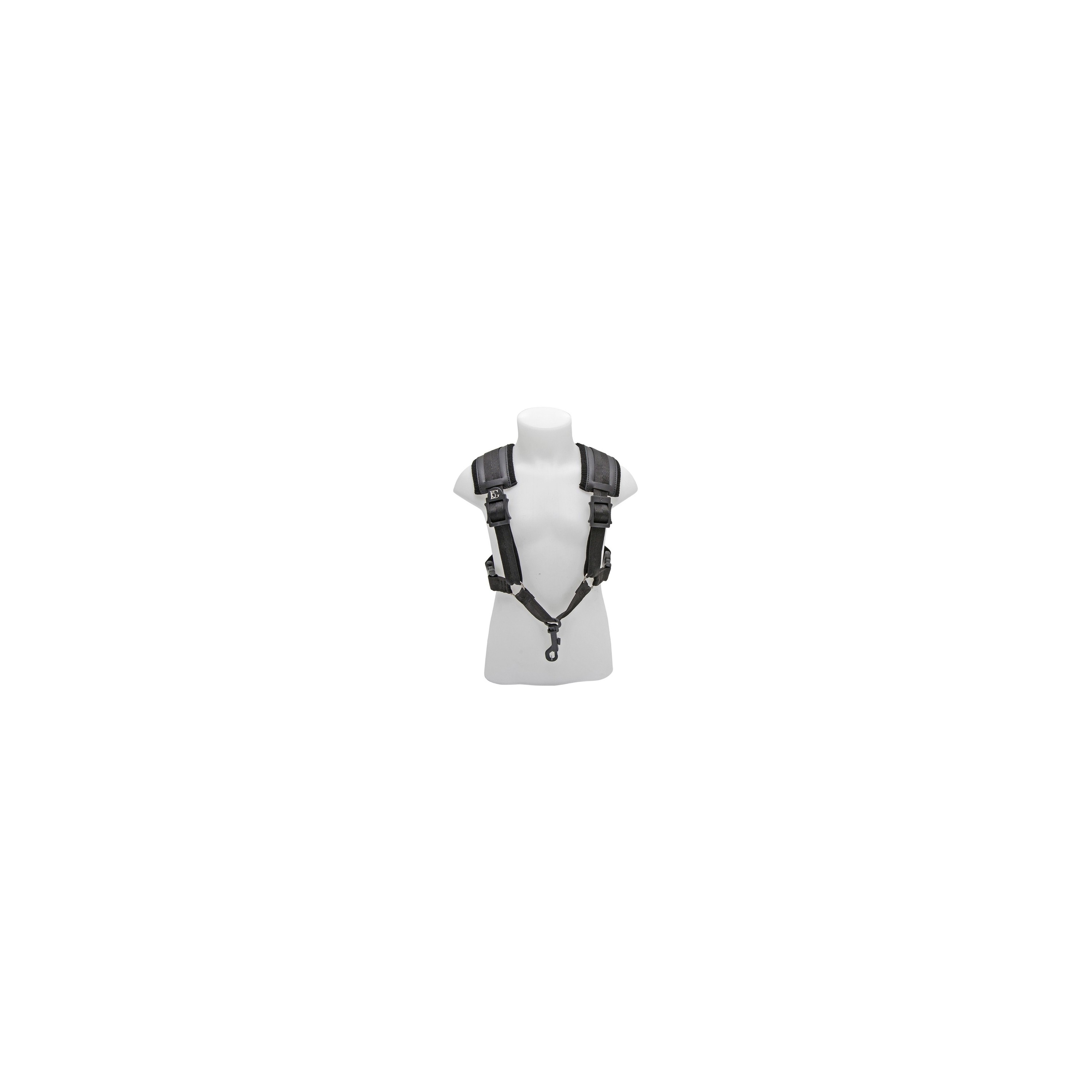 Arnés-confort para niño. Hombreras de piel forzadas y acolchadas para una mejor distribución del peso. Para saxofón alto, tenor o barítono. Gancho de mosquetón en plástico.