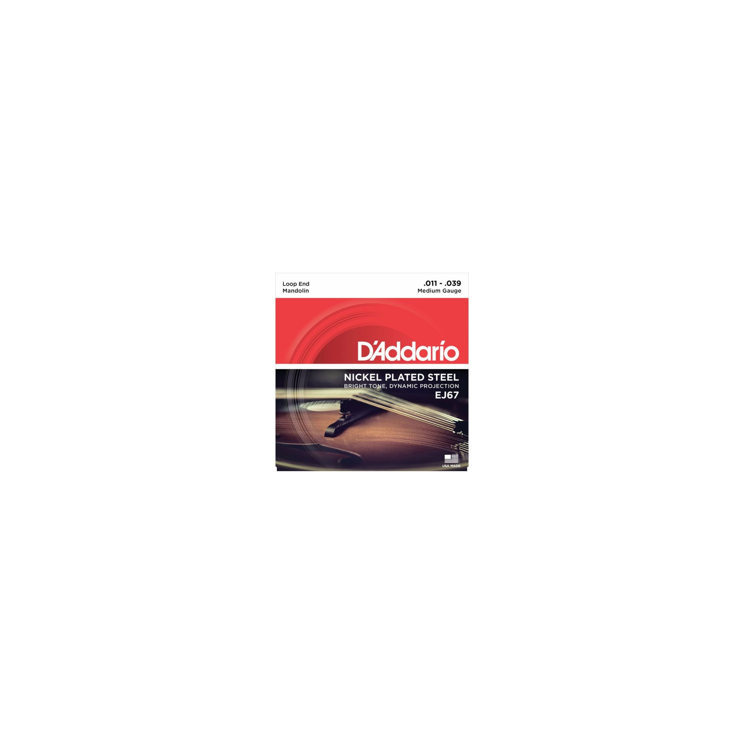 DADDARIO JUEGO DE CUERDAS PARA INSTRUMENTO J67 Nickel Mandolin Strings, Medium, [11-39]. Juego de cuerdas Nickel para Mandolina. EE AA DD GG (0,011, 0,014, 0,025, 0,039). Las cuerdas D"Addario J67 para mandolina son ideales para mandolinas eléctricas o acústicas. Las J67 tienen una cobertura de acero niquelado y son conocidas por su distintivo tono brillante y su excelente entonación.