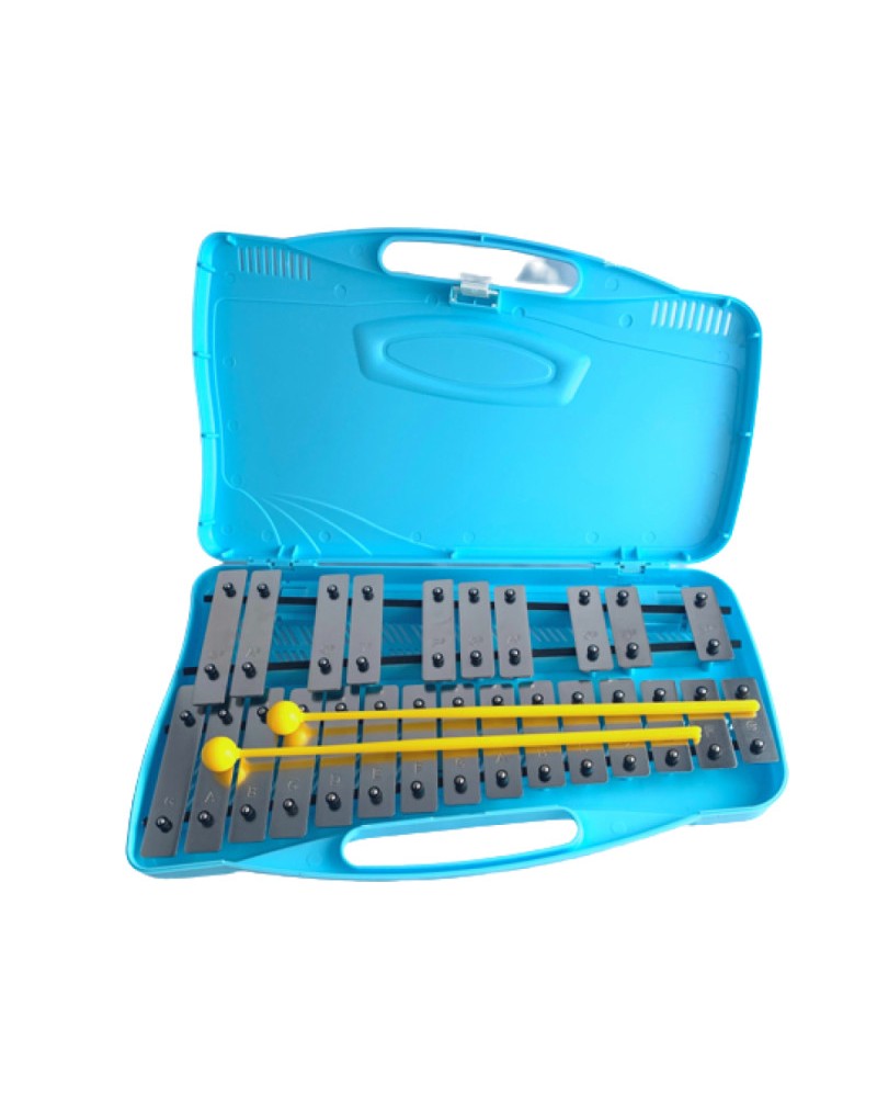 • Carrillón cromático de 25 teclas cromadas, con maletín azul de plástico. Incluye mazas