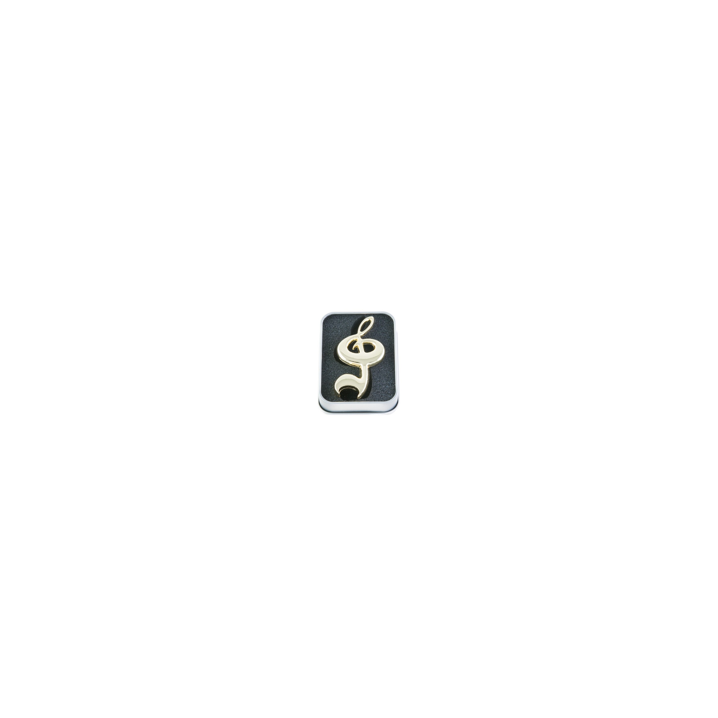 Abridor para botellas con forma de clave de sol en color dorado. Presentación en caja metálica.