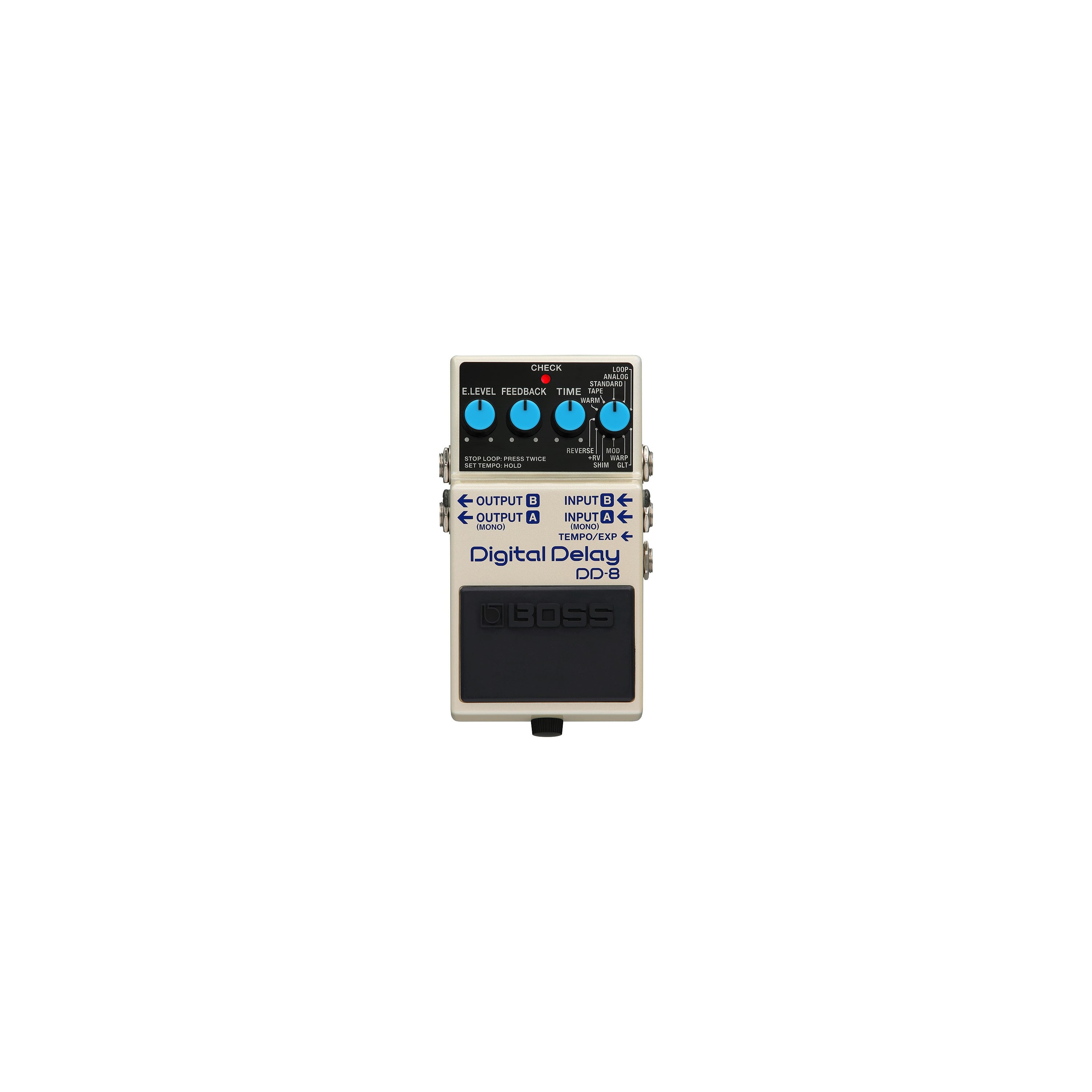 Equipado con una amplia selección de delays, el DD-8 encierra un impresionante rango sonoro en un pedal tan compacto. Dispones de delays digitales limpios, tipos analógicos y de cinta vintage y eco con modulación, además de delays especializados, como shimmer (con desplazamiento de tono) e invertido. Hay un tipo Warm que ofrece ecos más suaves, y otro +RV que combina delay y reverb. Warp es perfecto para tocar texturas ambientales dinámicas, mientras que el nuevo tipo GLT es genial para tocar efectos rítmicos con artefactos.